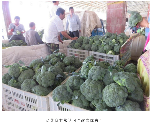根據當地種植“耐寒優秀”的劉姓的農戶提供的信息,他種植的“耐寒優秀”每畝地大約2500株左右,租地后成本大約1500-2000元,如果市場價格穩定,假設西蘭花價格2元/斤,畝產3000-4000斤左右,農戶每畝一年兩茬凈收入可達將近萬元。他種植坂田公司的“耐寒優秀”已經3年,蔬菜市場價格穩定的情況下,他都會獲得穩定的高收入。