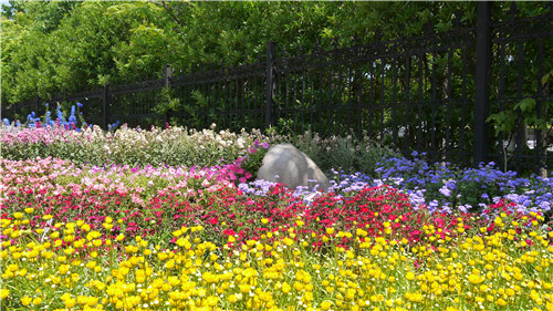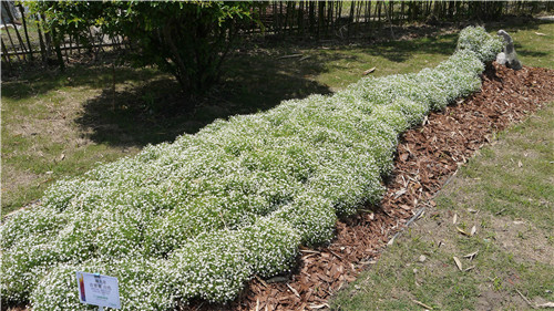 進入坂田種苗(蘇州)有限公司的大門,便可見右側大花壇運用花境設計方式種植了許多花卉品種,主要有紫羅蘭“四重奏”系列、藿香薊“藍色視野”、黃金菊“閃亮”、冰島虞美人“仙境”、銀蓮花“和諧”、大花飛燕草“燭光”系列、石竹“鉆石”系列、風鈴草“超級冠軍”系列和“冠軍”系列。