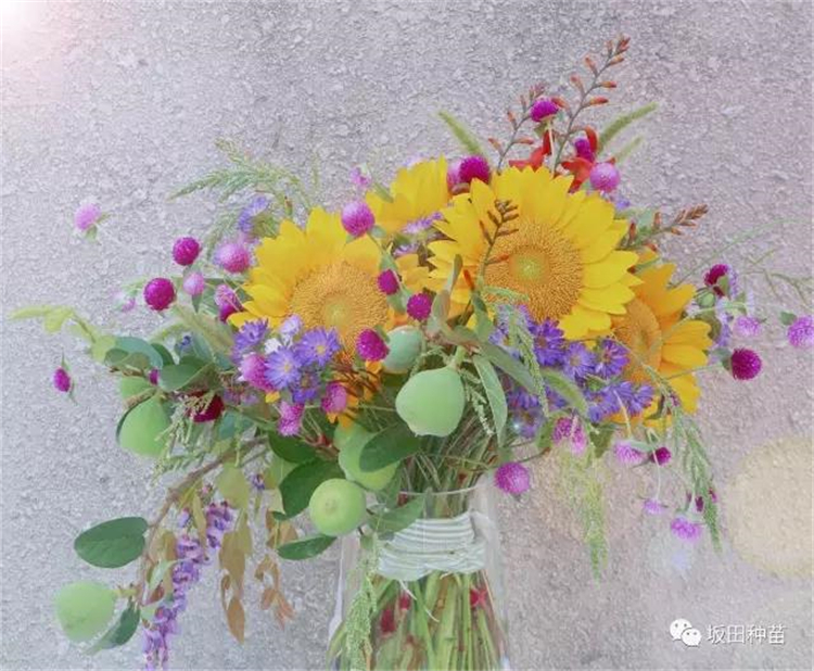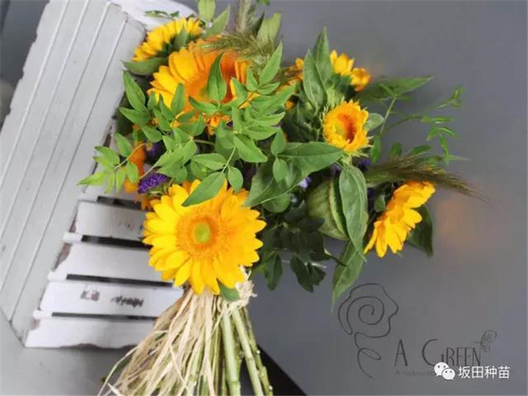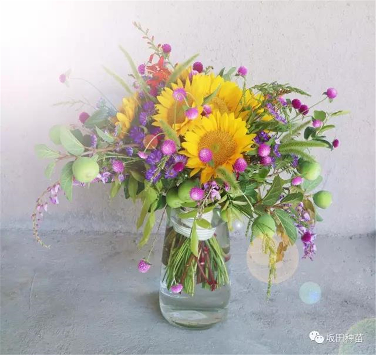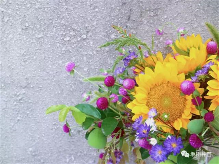 在千日紅、翠菊等精巧小花的簇擁下,更能顯示出向日葵作為主體的清新燦爛,又少了一分向日葵自身的粗壯感。