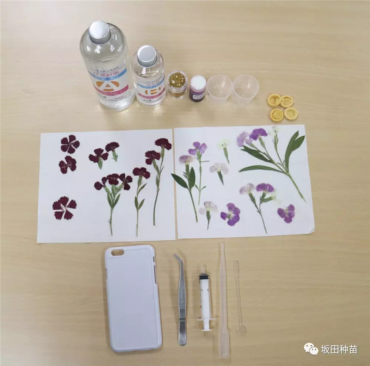 制作材料與工具:空白手機殼(新手建議背面有凹槽)、押好的干花、水晶滴膠(AB膠)、膠水、一次性塑料杯、針筒、剪刀、鑷子、木棍、牙簽、紙巾