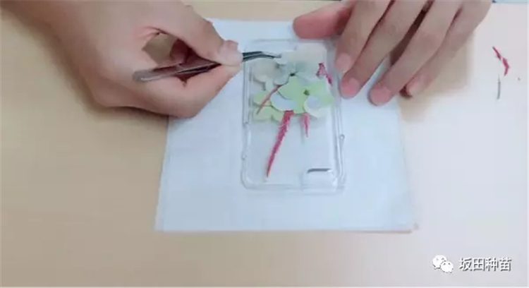 將押好的干花分類整理好,方便取用。用鑷子夾取干花放在手機殼背面,按照自己的設計提前擺放好,并拍照,方便后邊查看。