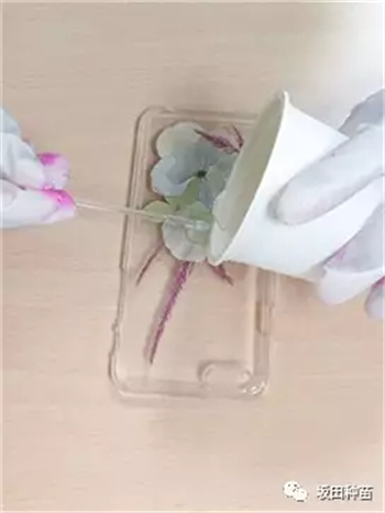 將配好的水晶滴膠從手機殼中間慢慢倒出,先少倒一些,以防后邊溢膠。