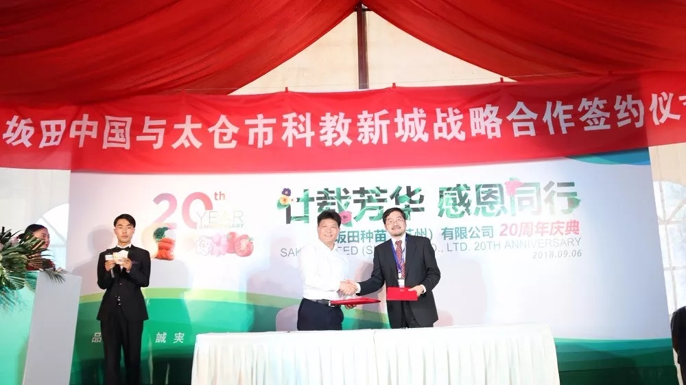 坂田中國與太倉市科教新城簽訂戰略合作關系,坂田種苗(蘇州)有限公司副董事長兼總經理樓惠寶以及太倉市科教新城黨工委書記陸定峰出席簽約